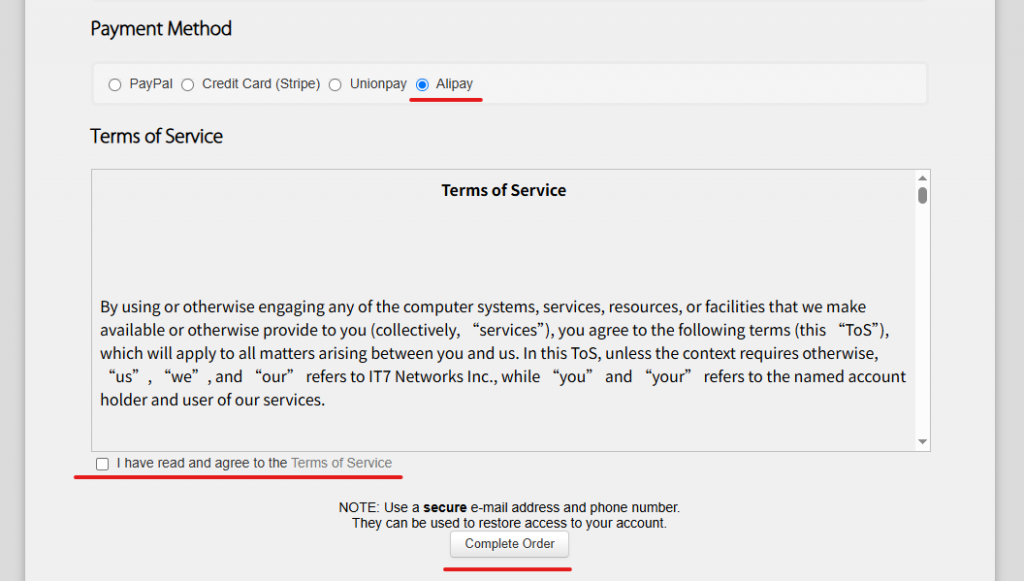 新用户按注册提示填写资料,勾选 Alipay(支付宝) 与 TOS,完成购买。