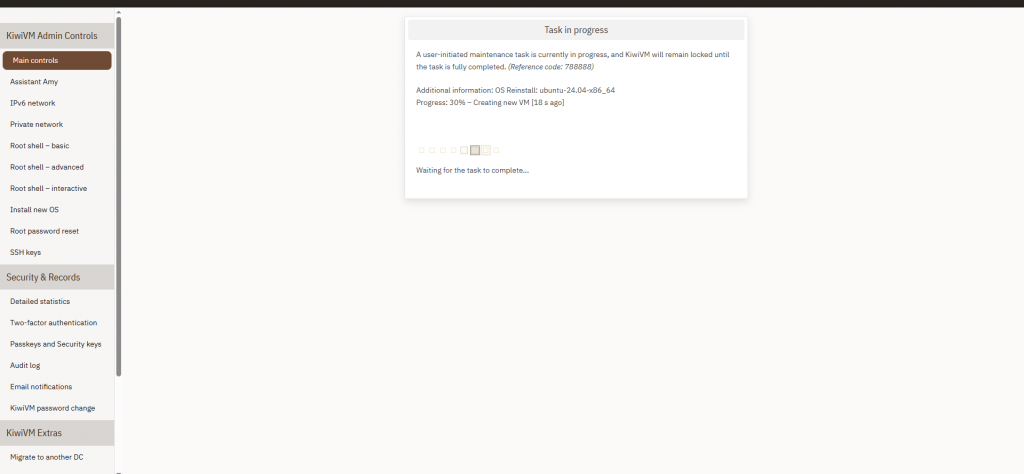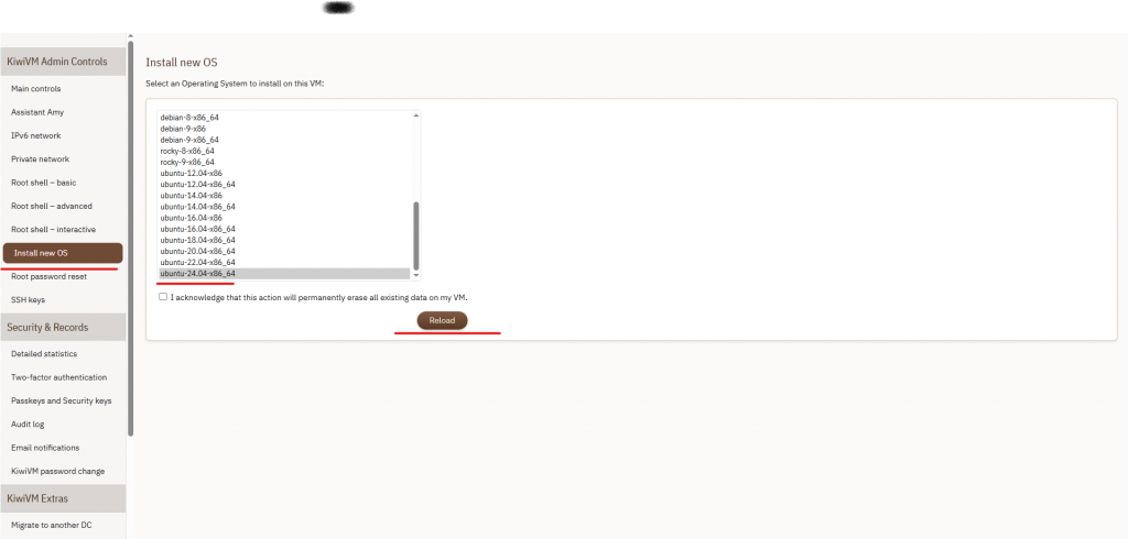 Stop 服务器 → 左侧 Install new OS → 下滑到底部选择 Ubuntu 24.04 → 点击 Reload 安装。