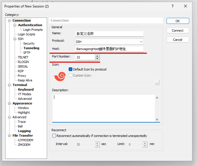- 打开 Xshell,新建会话:Host 填服务器 IP,Port 填邮件或面板中的 SSH 端口,点击 Connect。