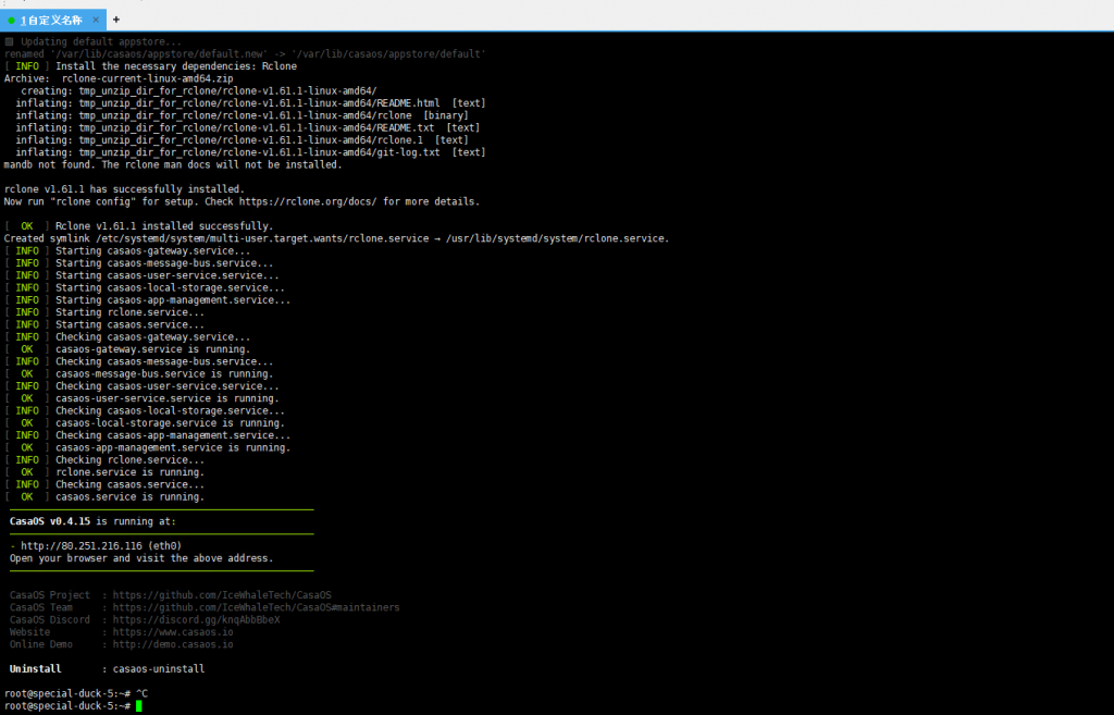 注:不要在 CasaOS 网页内置终端里跑,UI 重启会断连。 - 卸载 CasaOS