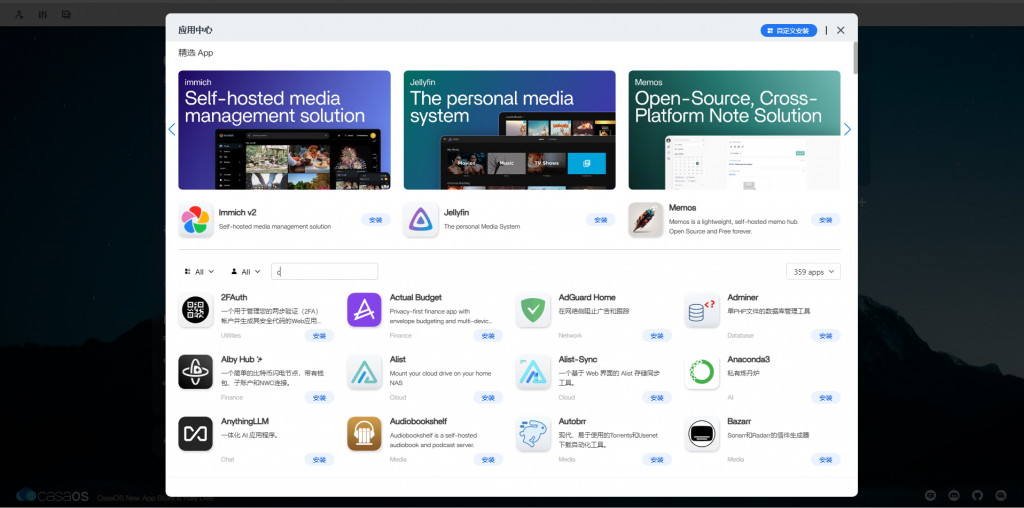 把它想象成一台服务器上的 “应用商店 + 桌面”:你通过浏览器打开一个漂亮的控制面板,像装手机 App 一样点一点就能安装/管理 常见自托管应用(比如 Jellyfin 影视库、Nextcloud 网盘、qBittorrent 下载器、Immich 相册、Vaultwarden 密码库、Uptime Kuma 监控等)。